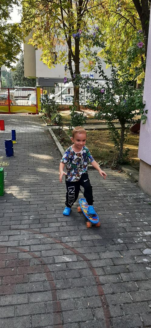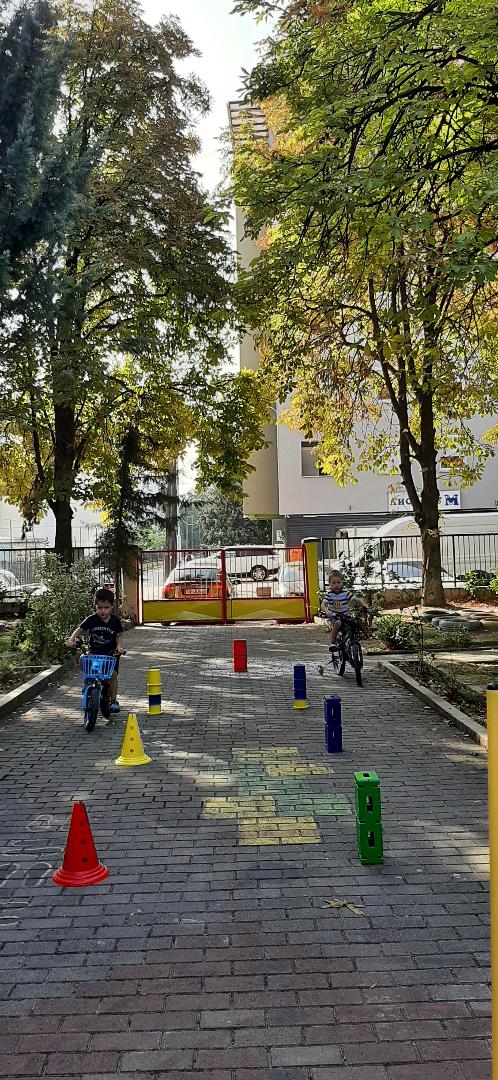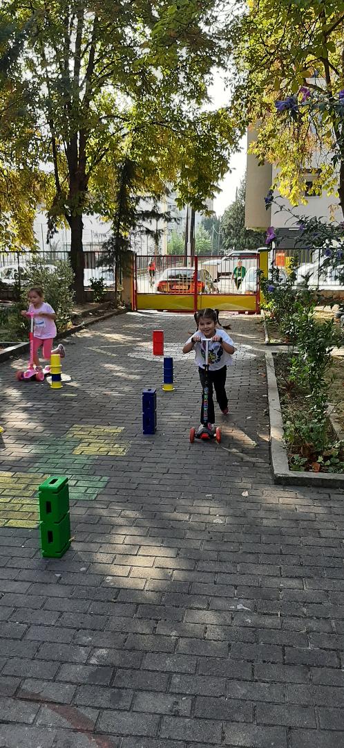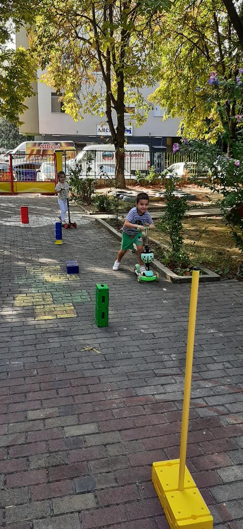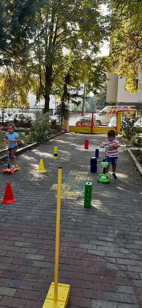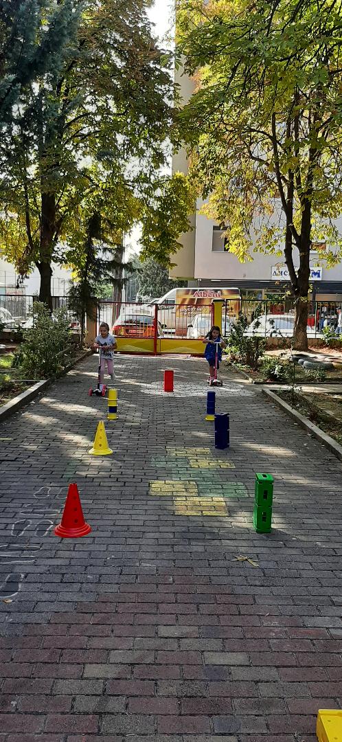Децата играа натпреварувачки игри со тротинети и велосипеди на импровизиран полигон во дворот на градинката, за да дишиме почист воздух,ден без автомобили.