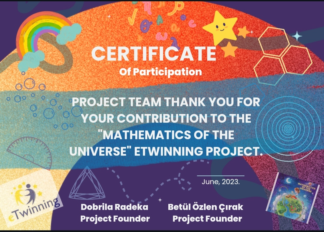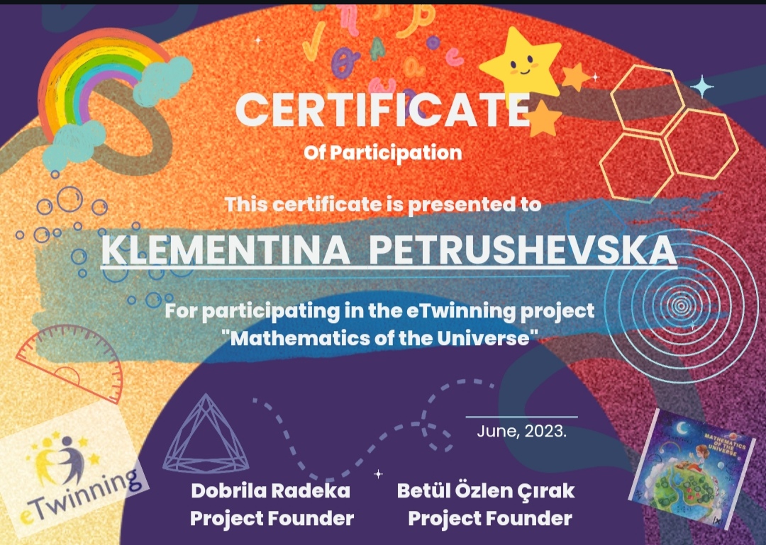 Успешна реализација на E Twinning проект на тема,, Mathematics of the universe,,. Реализација на низа колаборативни активности преку примена на истражувачки метод, критичко мислење, конструктивистички пристап, слободно изразување, користење на различни алатки, технологија, меѓусебна поддршка, соработка и развивање на лични компетенции.