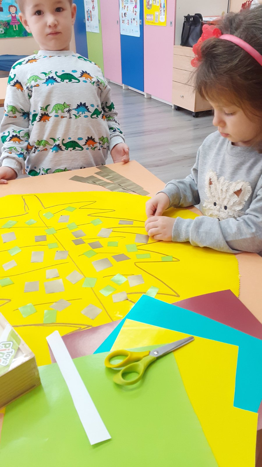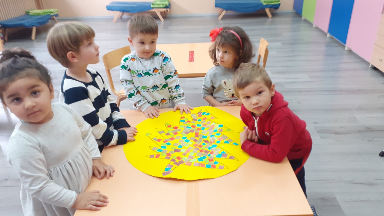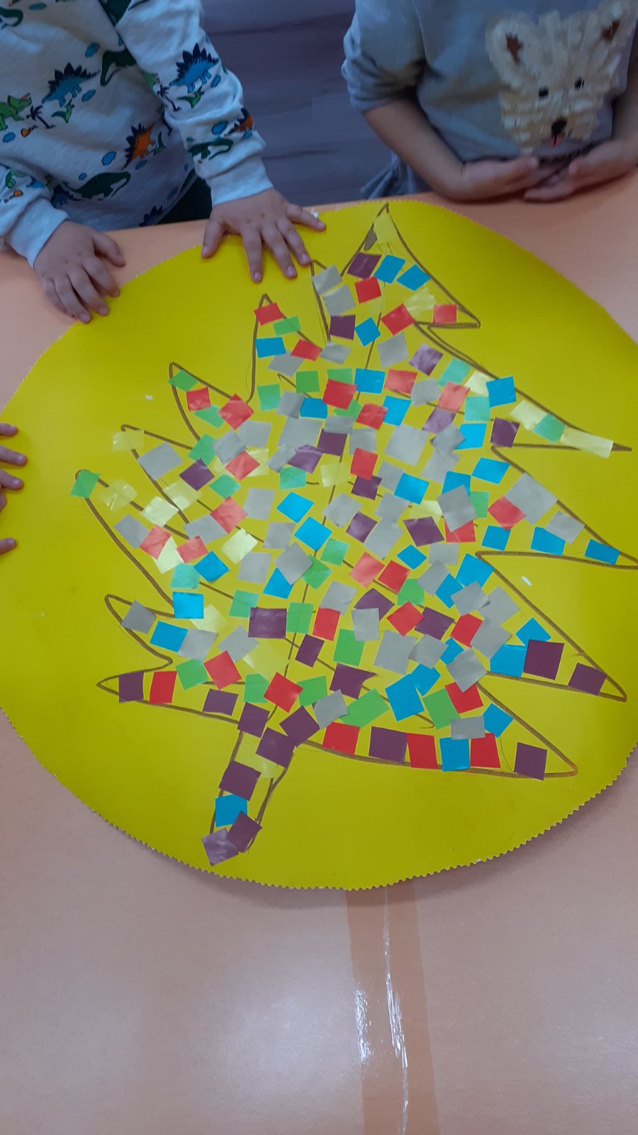 Децата од објект Перуника 2-4 годишна возраст со своите вредни рачиња изработиа голем есенски лист од колаж.