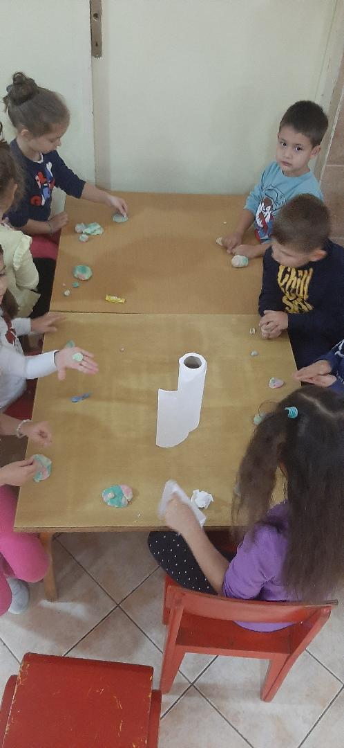 Децата правеа кифлички со тесто во боја додека јас и Марта замесивме пита со јаболка,го тегневме тестото и го испековме во шпорет во кујна. Децата го дегустираа со сласт.Исто така се запознавме со нашата македонска носија со сите нејзини делови појас,елече,марама,сукња и.т.н.