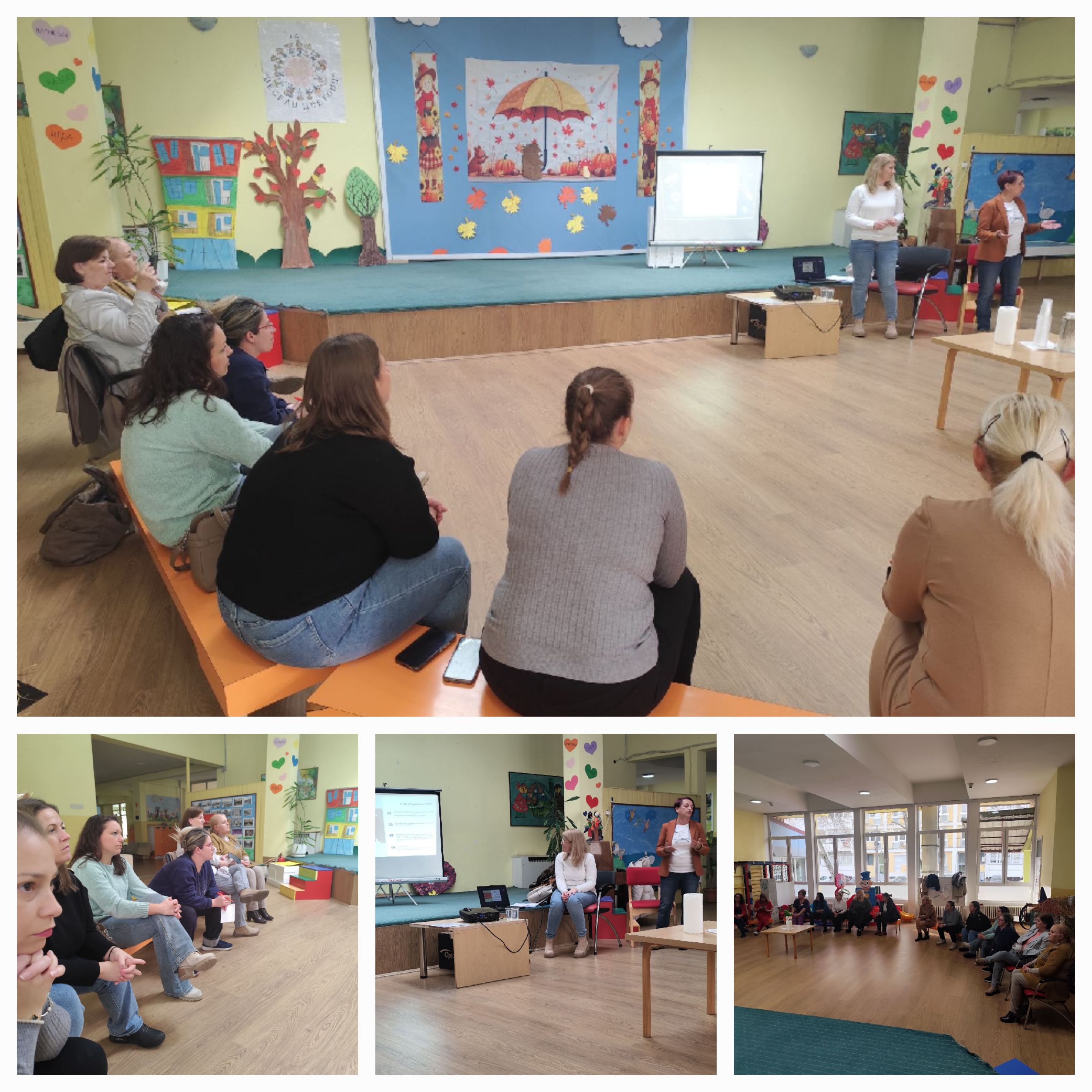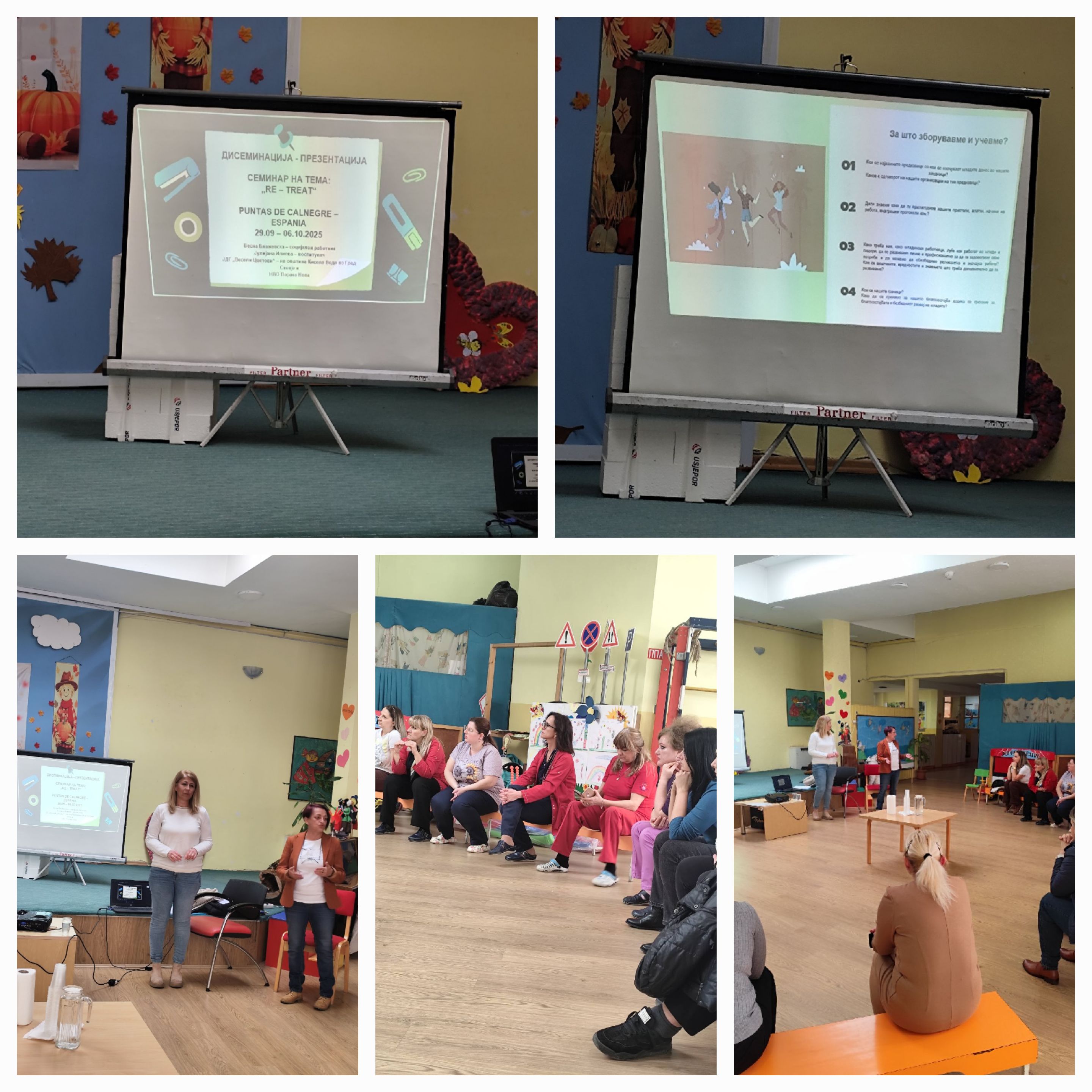На ден 17.11.2025 година со почеток од 12:00 часот во објект Сончоглед се одржа дисеминација во вид на обука за проектот „Re-treat" од Еразмус+ програмата. Како резултат на остварена соработка со Граѓанското здружени Порака НОВА - Битола, две вработени од нашата предучилишна установа беа избрани за учество на Семинар, кој се одржа во Шпанија. Вработените Јулијана Илиева - воспитувач и Весна Блажевска - социјален работник, кои беа претставници од Македонија, заедно со уште шест други држави од Европа, реализираната дисеминација ја збогатија со продлабочување на соработката со локалната самоуправа, односно со општина Кисела Вода, на тој начин што присуствуваа и земаа учество г-ѓа Охрида Арсовска - Советник за следење на проекти од Одделението за предучилишно воспитување при општина Кисела Вода и г-ѓа Валентина Цветковска - Советник во Секторот за предучилишно воспитување, образование, спорт и култура при општина Кисела Вода.